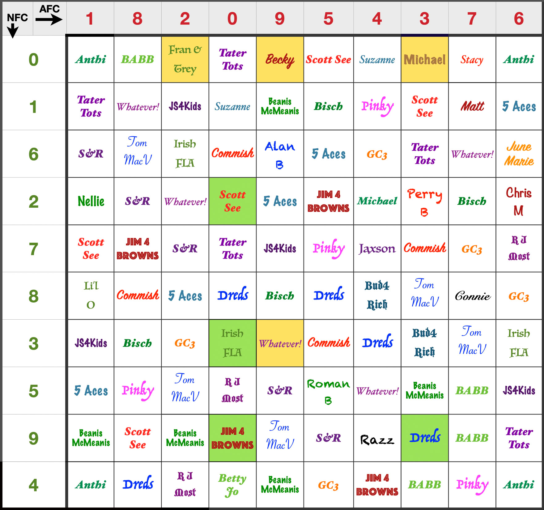 The entry fee is $10 per square. There will be two awards at the end of each quarter. As with most squares pools the winner will be the square Wirth the correct ending digits for AFC and NFC at the end of each quarter. That prize will be $175. In an effort to spread some of the winnings, we will award $75 to the square that is the reverse of the winning =square. So if AFC is winning 13-7, the winning square AFC-3, NFC 0 will win 175. The reverse square (NFC - 3 AFC - 0 wins $75. In this scenario, there are 10 “magic” squares that are the same numb er for each team. These squares will pay out $250 as they are the reverse square as well.